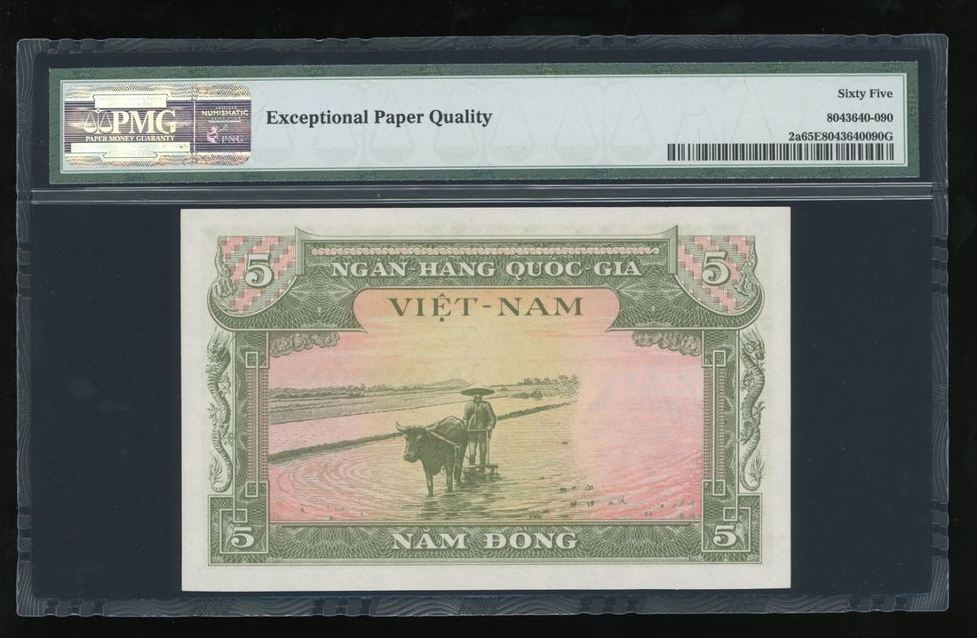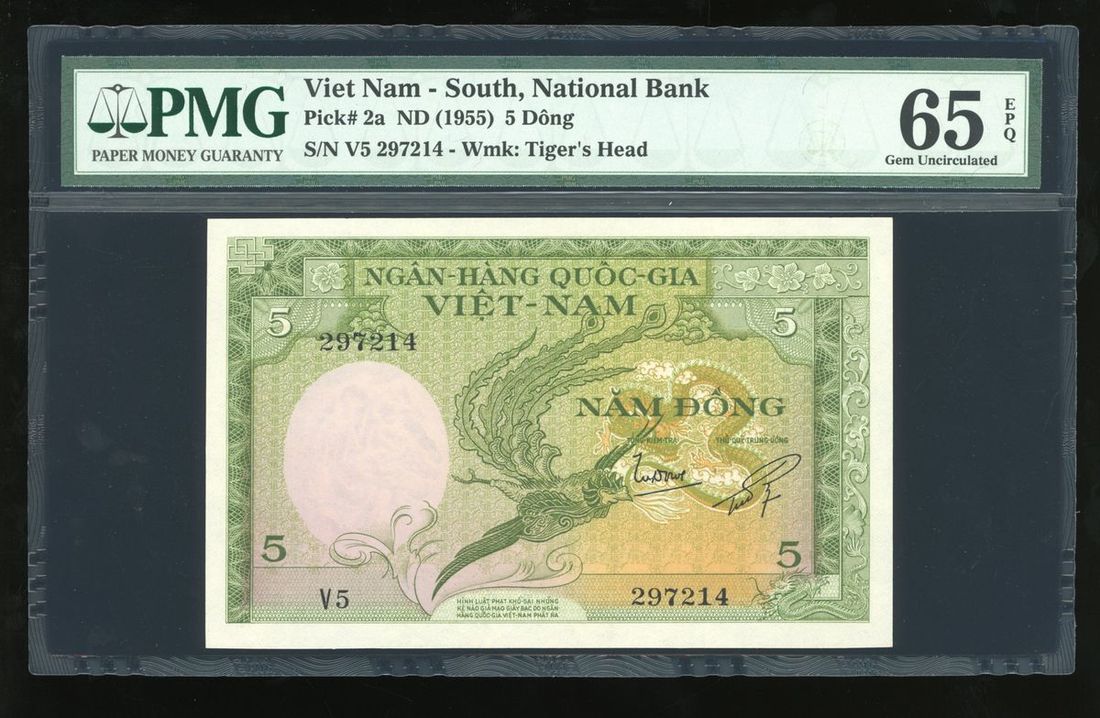 South Viet Nam, National Bank, 5 dong, no date (1955), serial number V5 297214, (Pick 2a), PMG 65EPQ Gem Uncirculated.