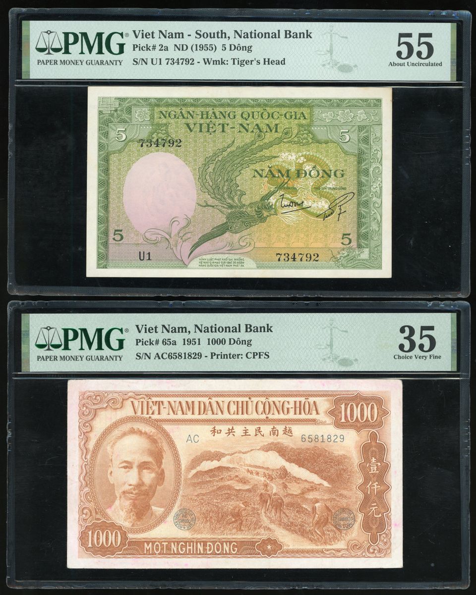 National Bank, Viet Nam-South, Viet Nam, A Group of 2x including, 5 Dong, 1000 Dong, ND (1955), 1951, serial number U1-734792, AC6581829,