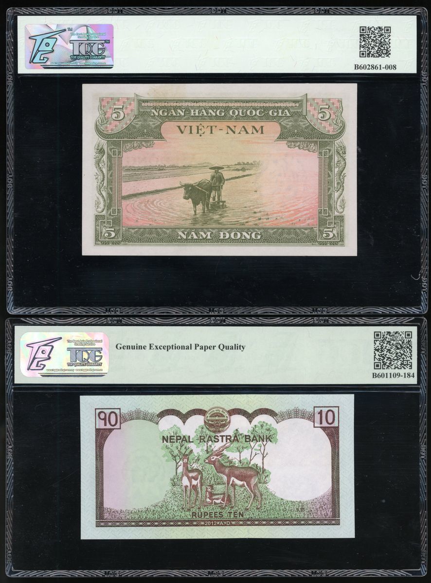 Mixed lot, Vietnam-South, 5 dong, ND(1955), serial number N4 589305 and Nepal, 10 rupees, ND(2013), serial number 285884, (Pick 2a, 70), TQG 63 and 66GEPQ respectively.(2)
