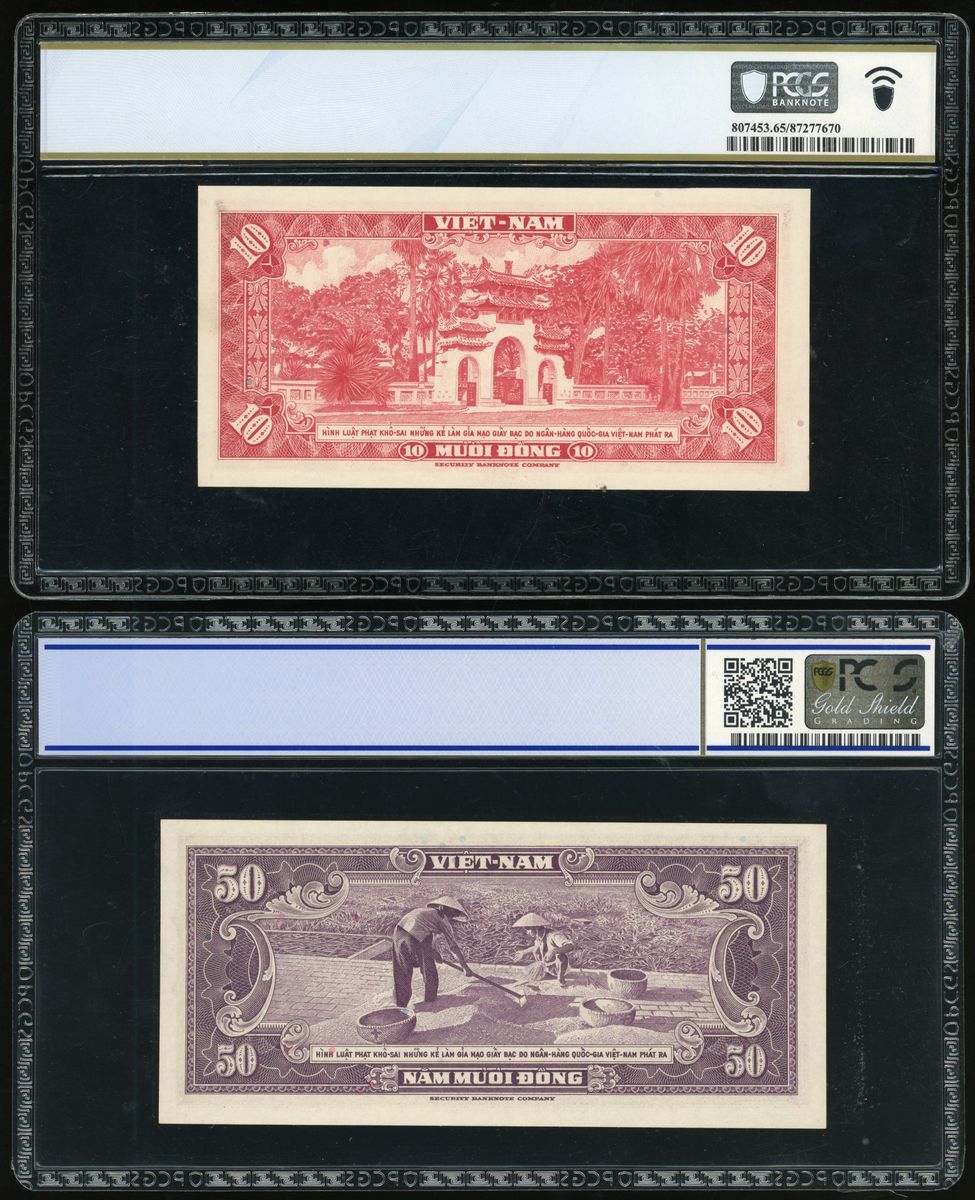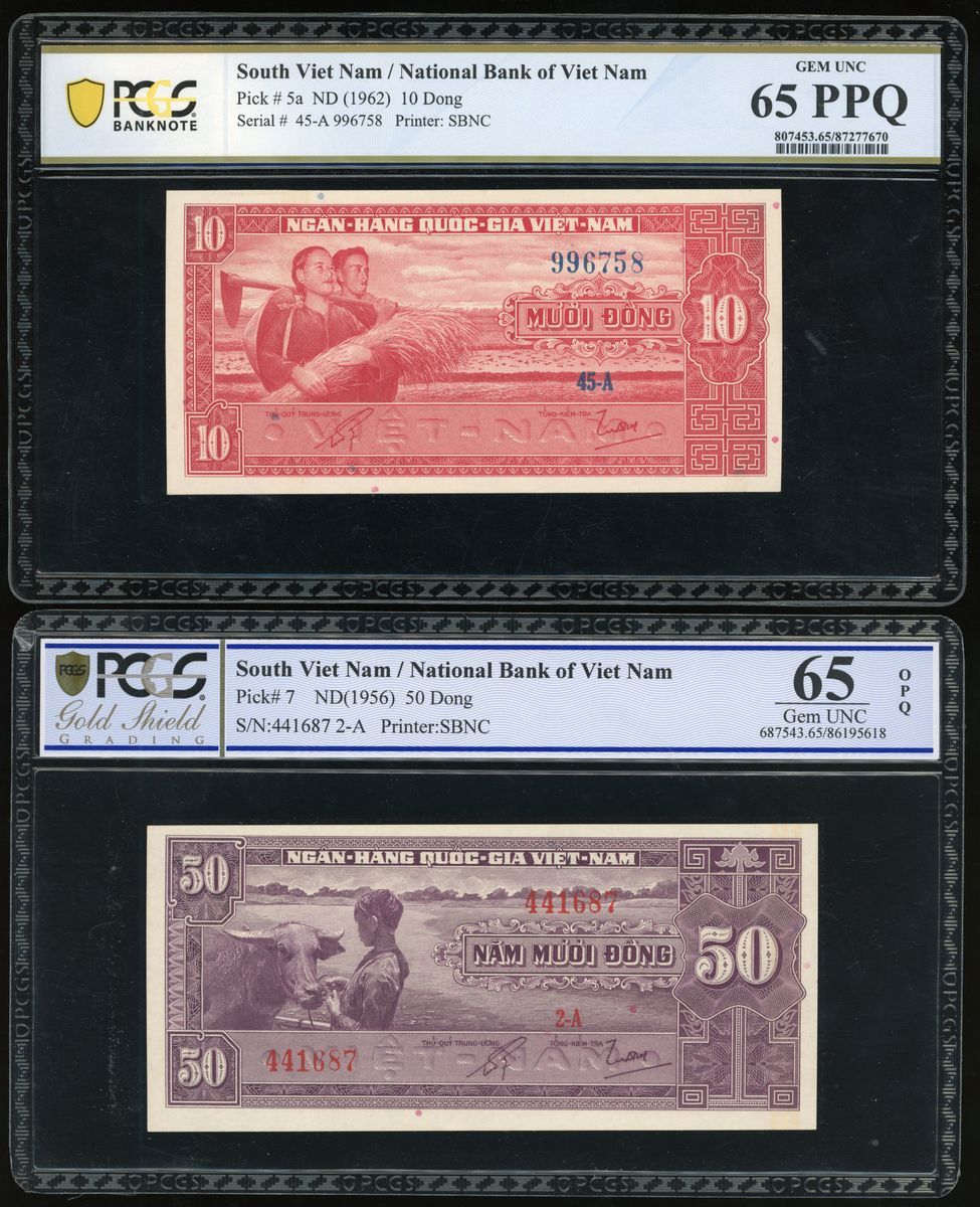 South Viet Nam, National Bank of Viet Nam, a pair of 10 dong and 50 dong, 1962 and 1956, serial numbers 45-A 996758 and 441687 2-A, (Pick 5a and 7), graded PCGS Banknote 65PPQ and PCGS Gold Shield 65OPQ respectively (2).