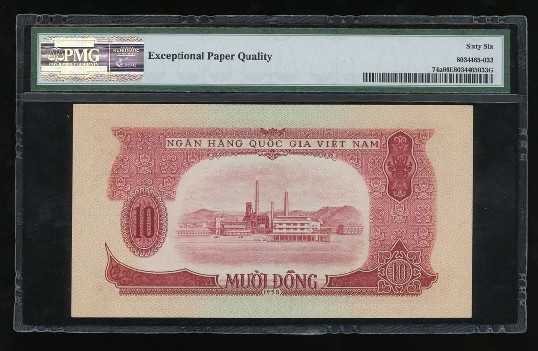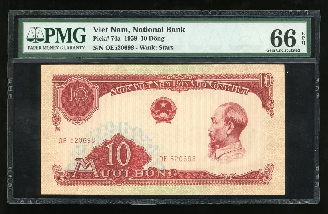 Viet Nam, National Bank, 10 dong, 1958, serial number OE520698, stars watermark, (Pick 74a), PMG 66EPQ Gem Uncirculated.