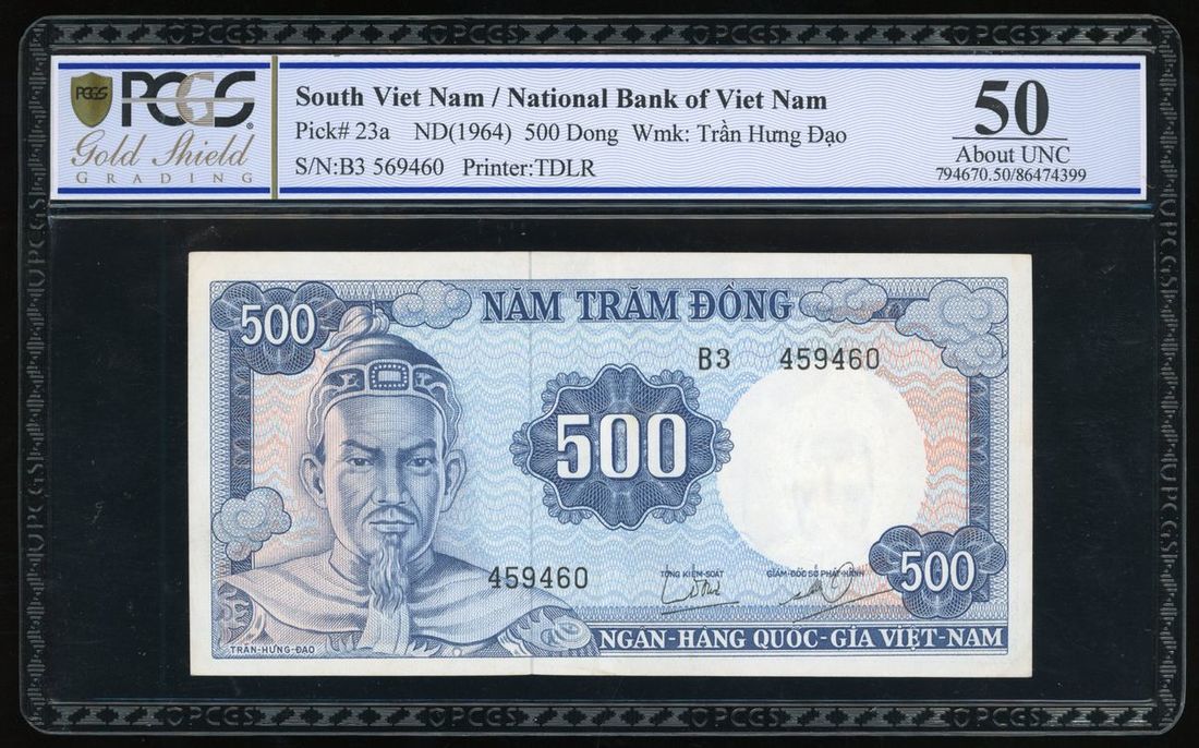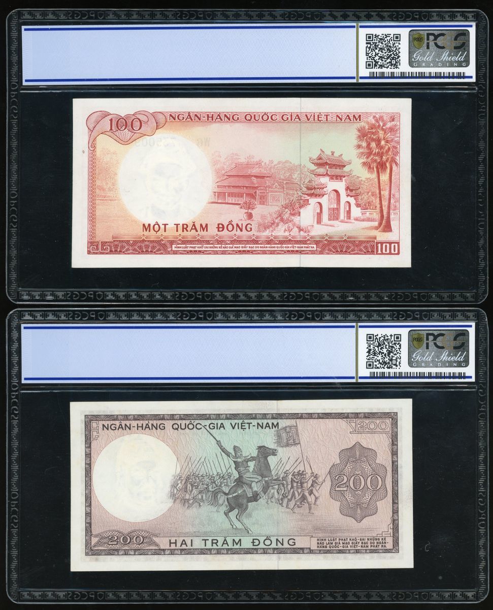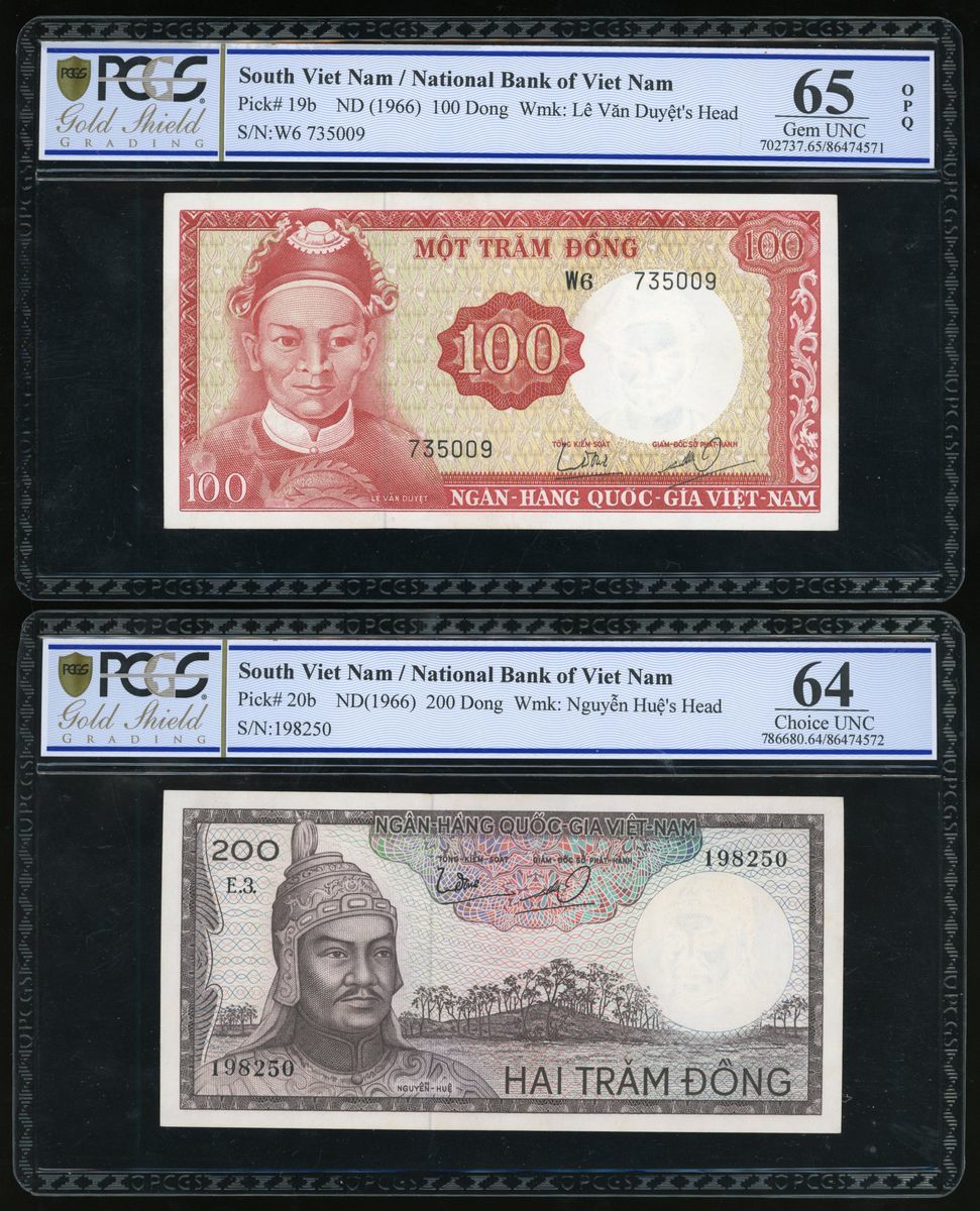 South Viet Nam, National Bank of Viet Nam, a group of 3 notes, consists of 100, 200 and 500 dong, 1964-1966, serial numbers W6 735009, 198250 and B3 569460, (Pick 19b, 20b and 23a), graded PCGS Gold Shield 65OPQ, 64 and 50 respectively (3).
