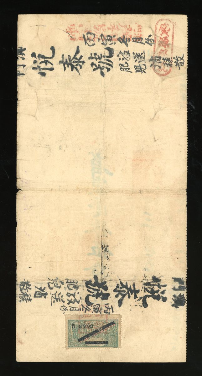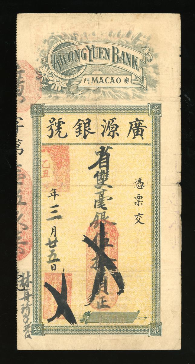 Kwong Yuen Bank, Macau, 50 silver yuan, 1925, vertical format, green on yellow underprint, red seals, reverse with revenue stamp,