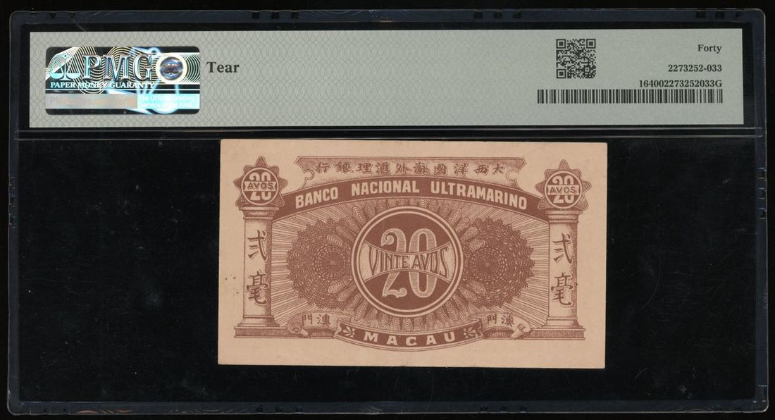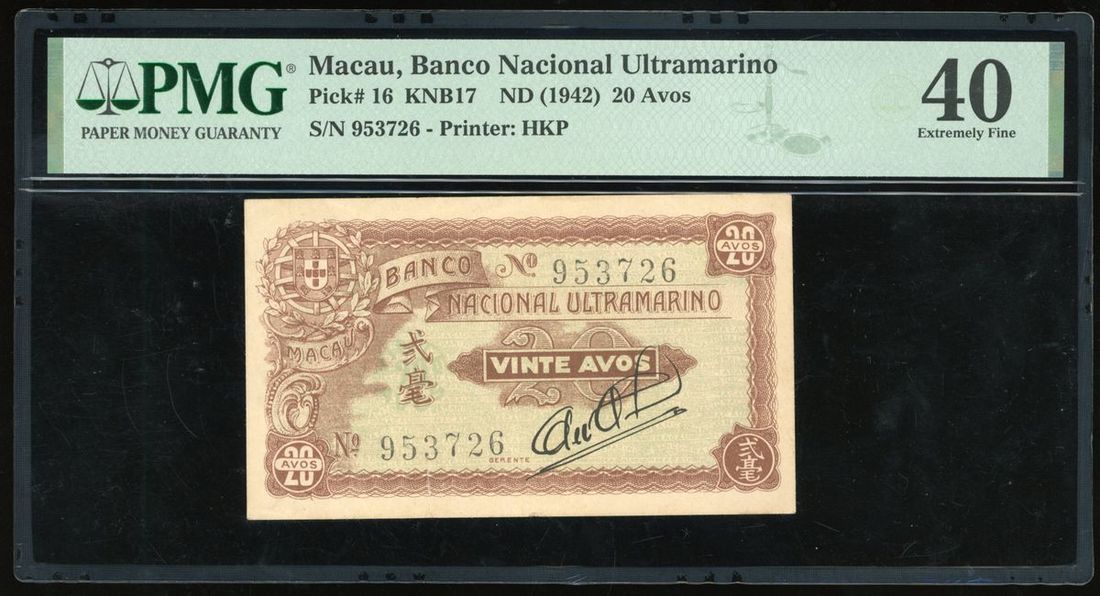 Banco Nacional Ultramarino, Macau, 20 avos, ND (1942), serial number 953726, (Pick 16), PMG 40 Extremely Fine (Tear).