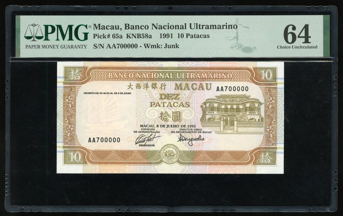 Banco Nacional Ultramarino, Macau, 10 patacas, 8.7.1991, serial number AA700000, (Pick 65a), PMG 64. Fancy serial!