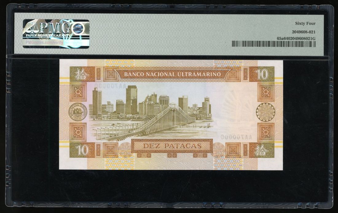 1991年澳門大西洋銀行拾圓,幸運號AA700000,PMG 64