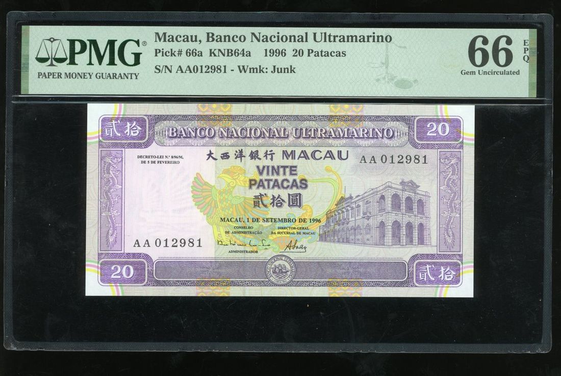 (x) Banco Nacional Ultramarino, Macau, 20 patacas, 1.9.1996, serial number AA012981, (Pick 66a), PMG 66EPQ