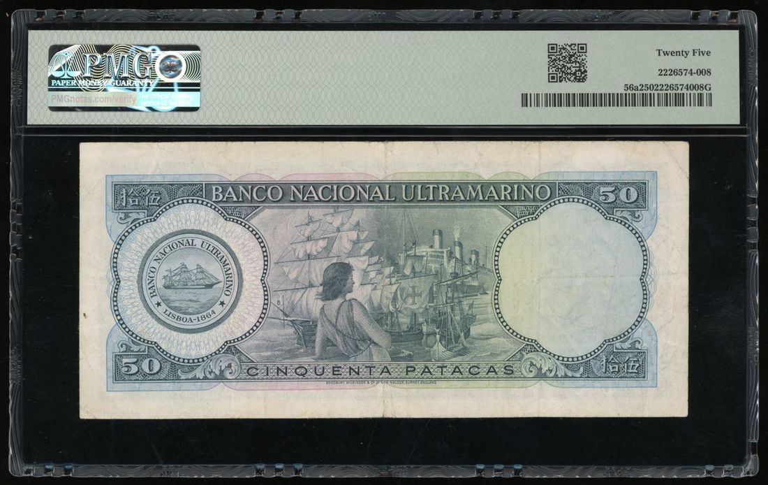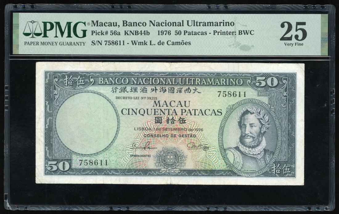 Banco Nacional Ultramarino, Macau, 50 patacas, 1976, serial number 758611, (Pick 56a), PMG 25 Very Fine.