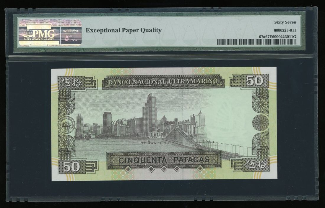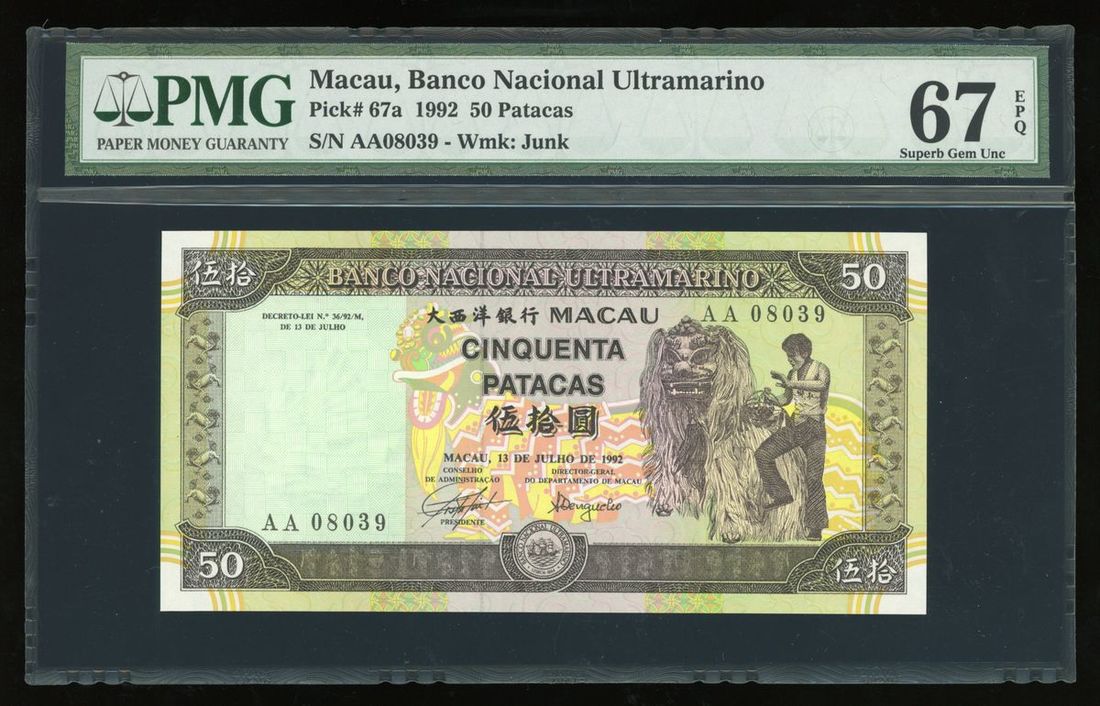 Banco Nacional Ultramarino, Macau, 50 patacas, 13.12.1992, serial number AA08039, (Pick 67a), PMG 67EPQ Superb Gem Uncicculated