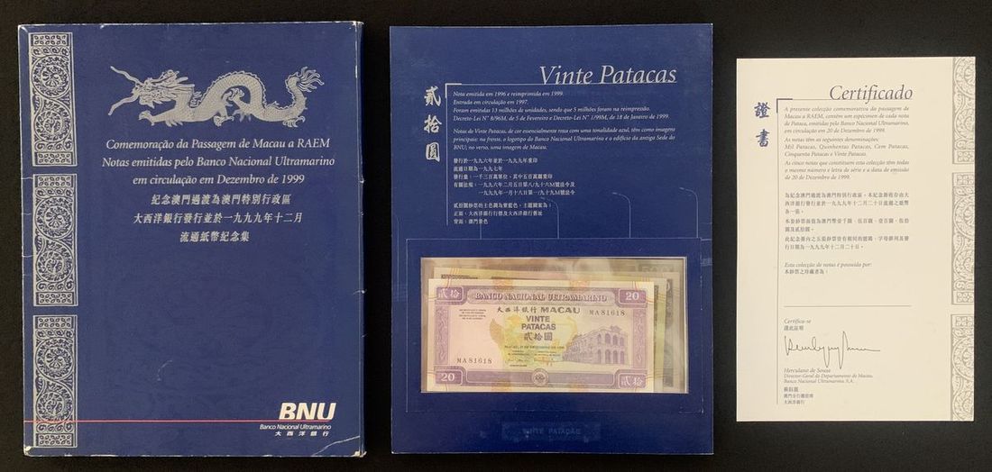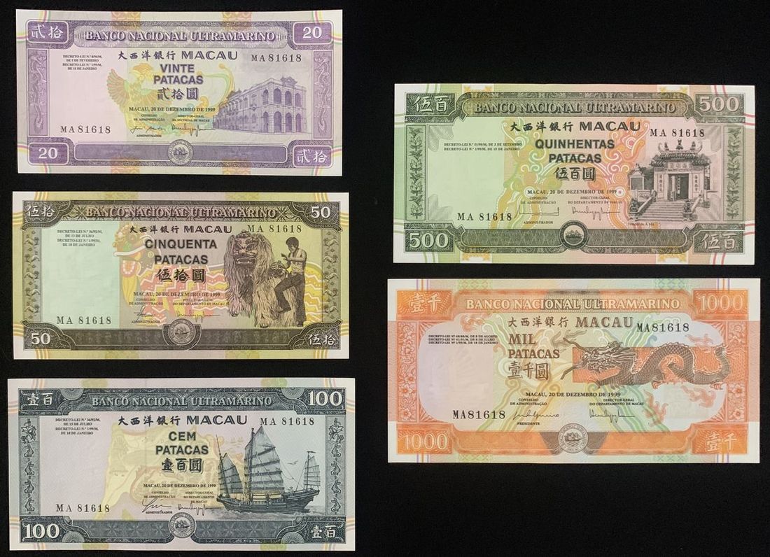 1999年澳門大西洋海外匯理銀行一組5枚,包括:貳拾圓、伍拾圓、壹百圓、伍百圓及壹千圓,相應編號MA81618,UNC品相,附原裝冊子及證書