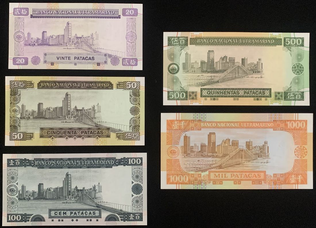 Banco Nacional Ultramarino, Macau, group of 5x matching serial numbers MA81618, including, 20, 50, 100, 500 and 1000 patacas, (Pick 71-75), uncirculated with original booklet and certificate, some signs of handling with the booklet.