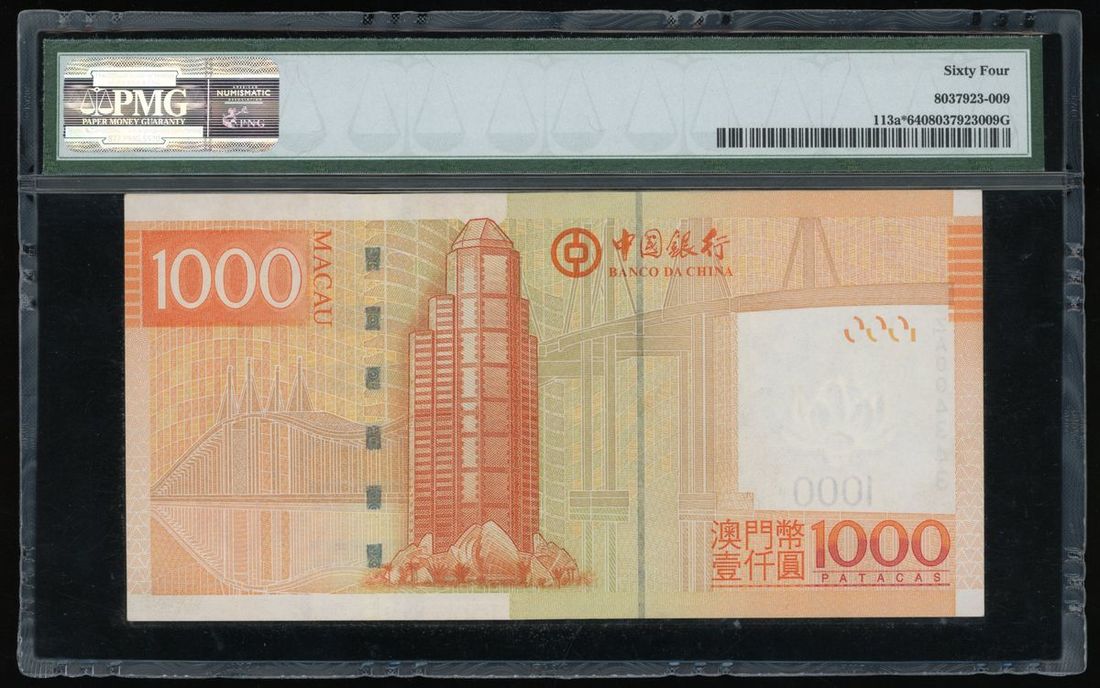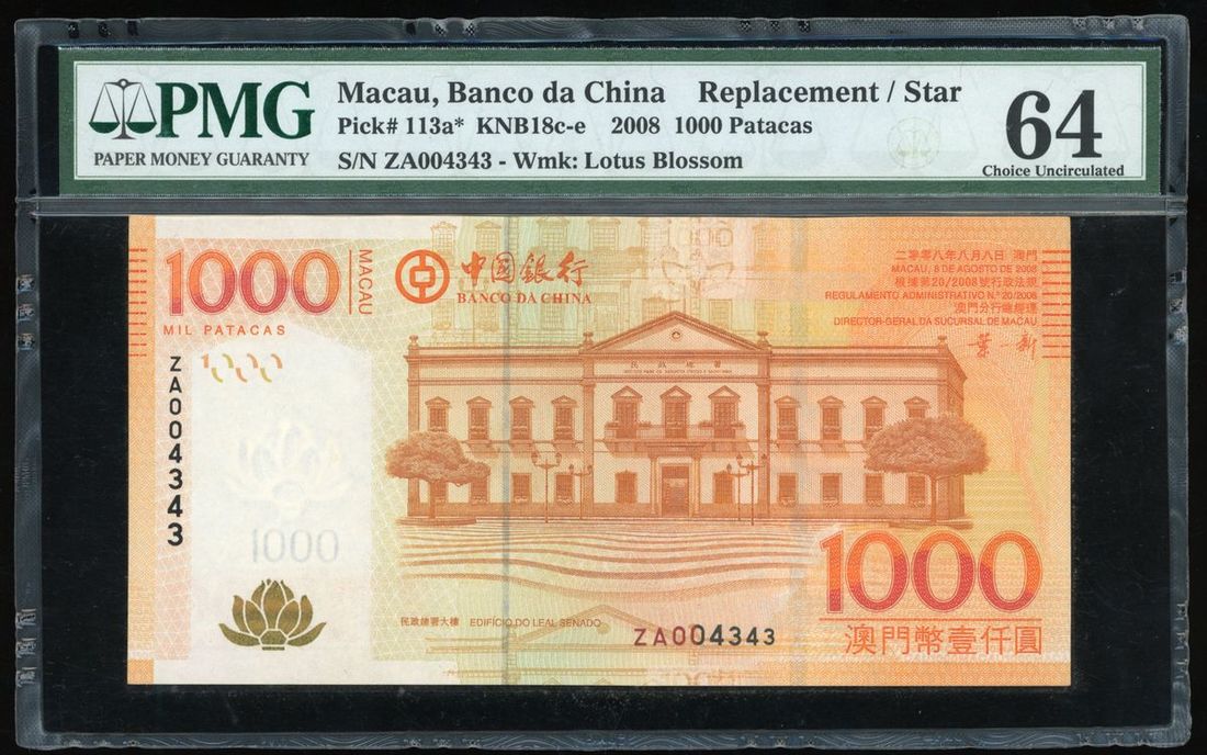 Banco da China, Macau Replacment $1000, 8.8.2008, serial number ZA004343, (Pick 113a*), PMG 64 Choice Uncirculated