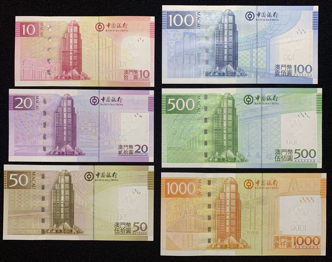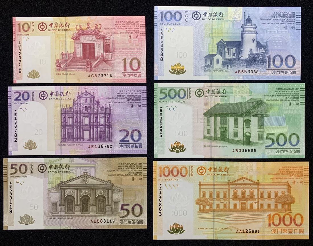 Banco da China, Macau, a set of 2008 issue, consists of 10, 20, 50, 100, 500 and 1000 patacas, serial numbers AC823716, AE138782, AB583119, AB653338, AB036595 and AA126863,