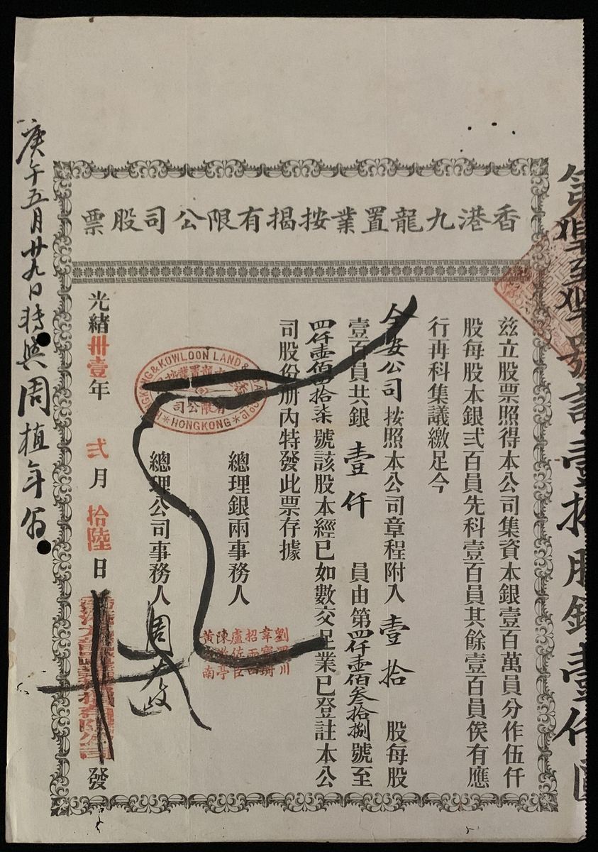 HongKong & Kowloon Land & Loan Company Limited, certificate for 10 shares for $1000 in total, 31st Year of Emperor Guangxu (1905), generally well kept, punched at left, with minor foxing, very fine