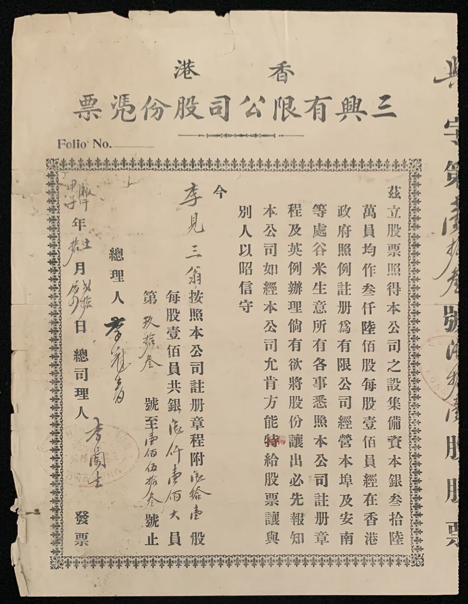 Sam Hing Limited Company, Hong Kong, certificate for 61 shares, $100 per share, 1924, with splits, about fine. The company mainly dealt in grain/rice trading between Hong Kong and Annam (Vietnam). Interesting