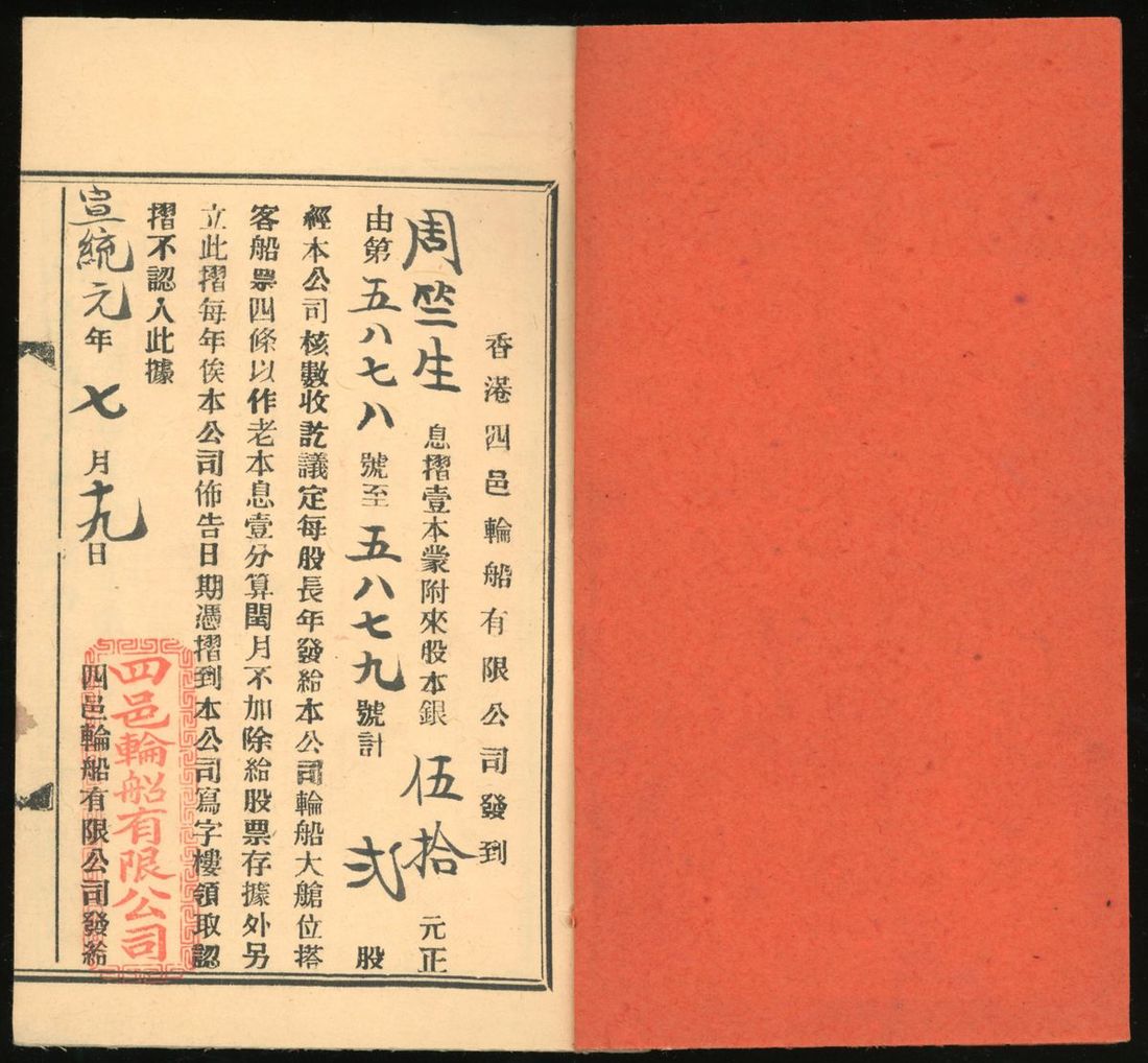 Sze Yap Steam Boat Company, Hong Kong, a receipt book of shareholder interest, 1 share of $50, Xuantong Year 1 (1909), original shareholder was Ng Meng Chiu and was later transferred to Chow Cuk Sang in 1924 (Year 13),