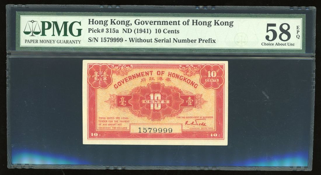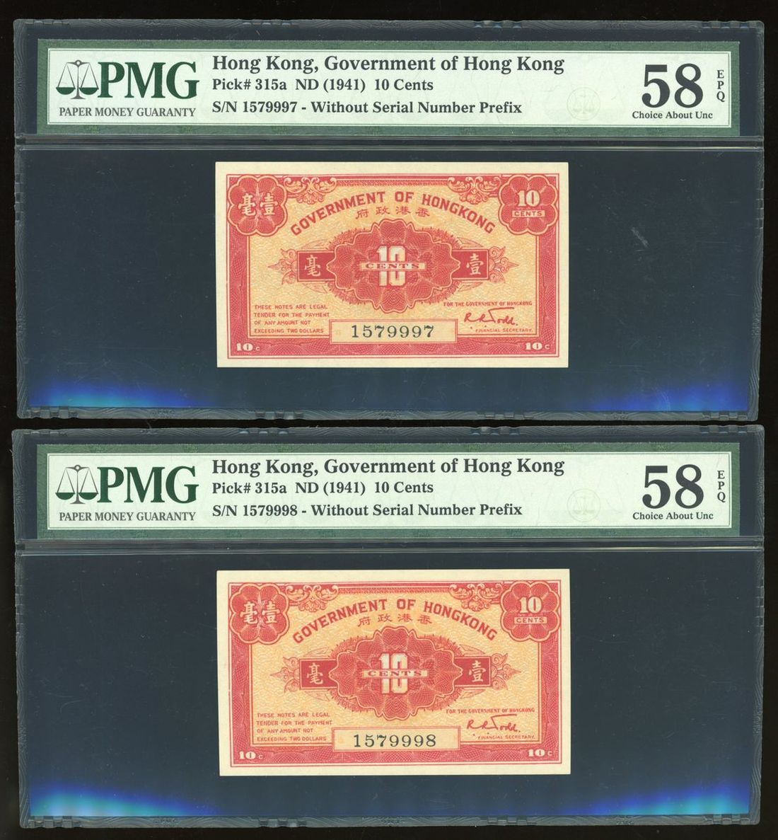 Government of HongKong, consecutive 10 cents (3), ND (1941), serial numbers 157997/8/9, (Pick 315a), all PMG 58EPQ