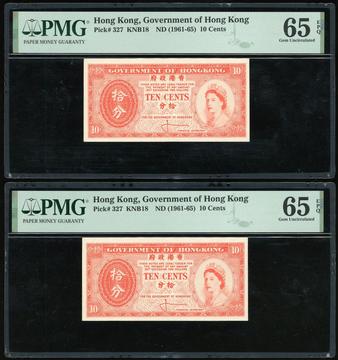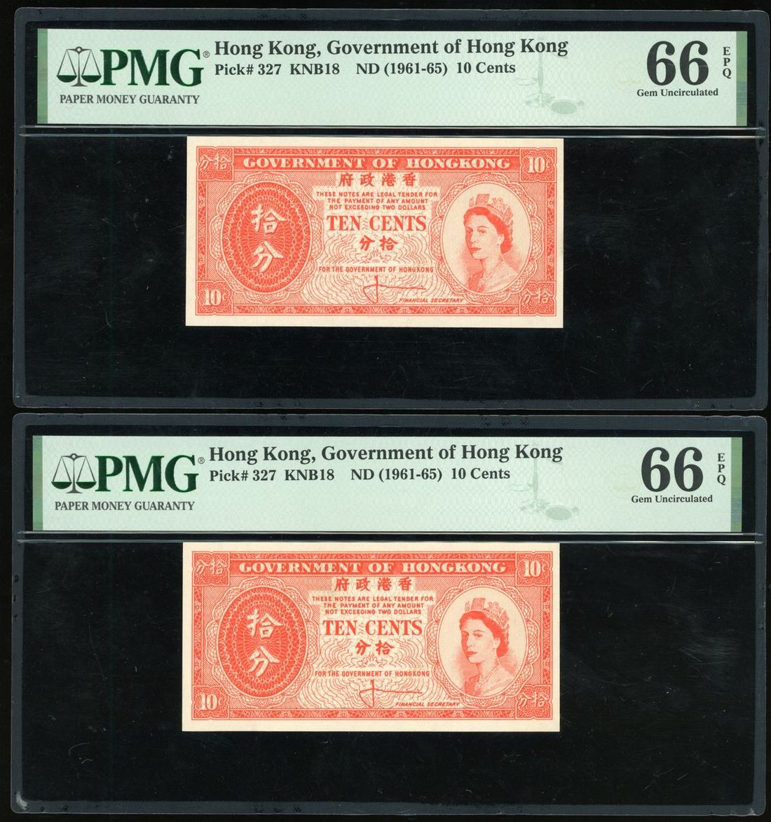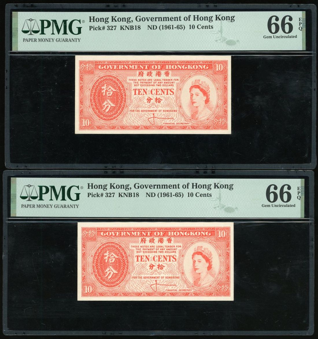Government of HongKong, A group of 6x of 10 Cents (6), ND (1961-65) (6), (Pick 327), PMG 65 EPQ Gem Uncirculated (2), 66 EPQ Gem Uncirculated (4)