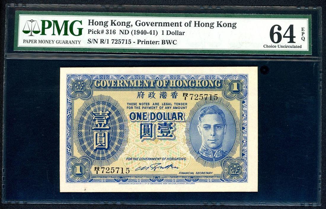 Government of HongKong, $1, ND (1940-41), serial number R/1 725715, (Pick 316), PMG 64EPQ