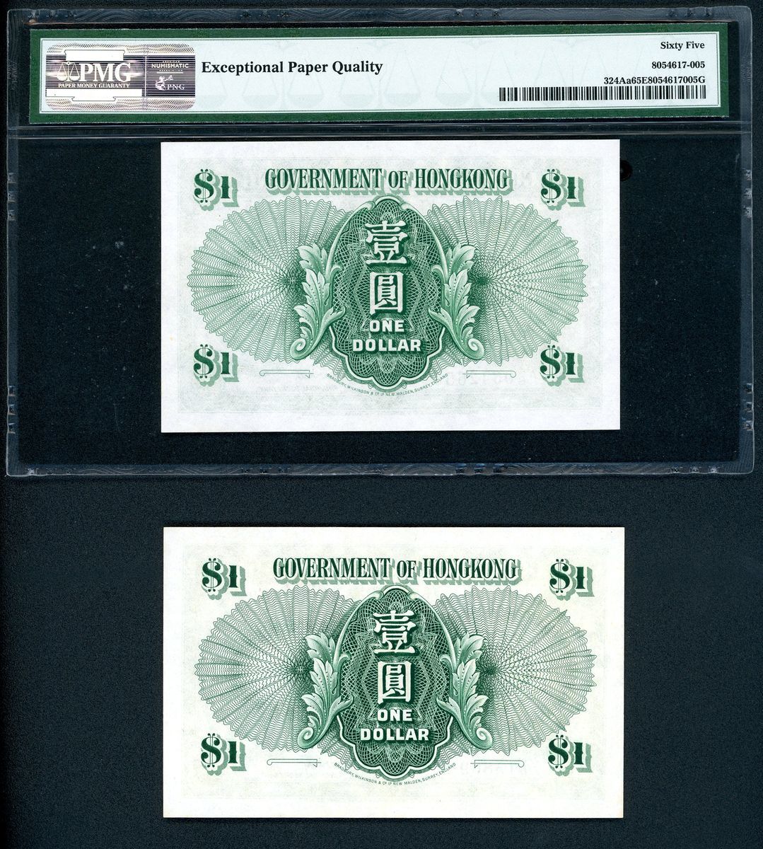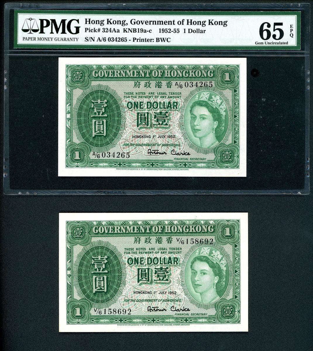 Government of HongKong, $1, 1.7.1952, serial number A/6 034265, 'first prefix', also a $1, 1.7.1952, serial number V/6 158692, 'near last prefix',