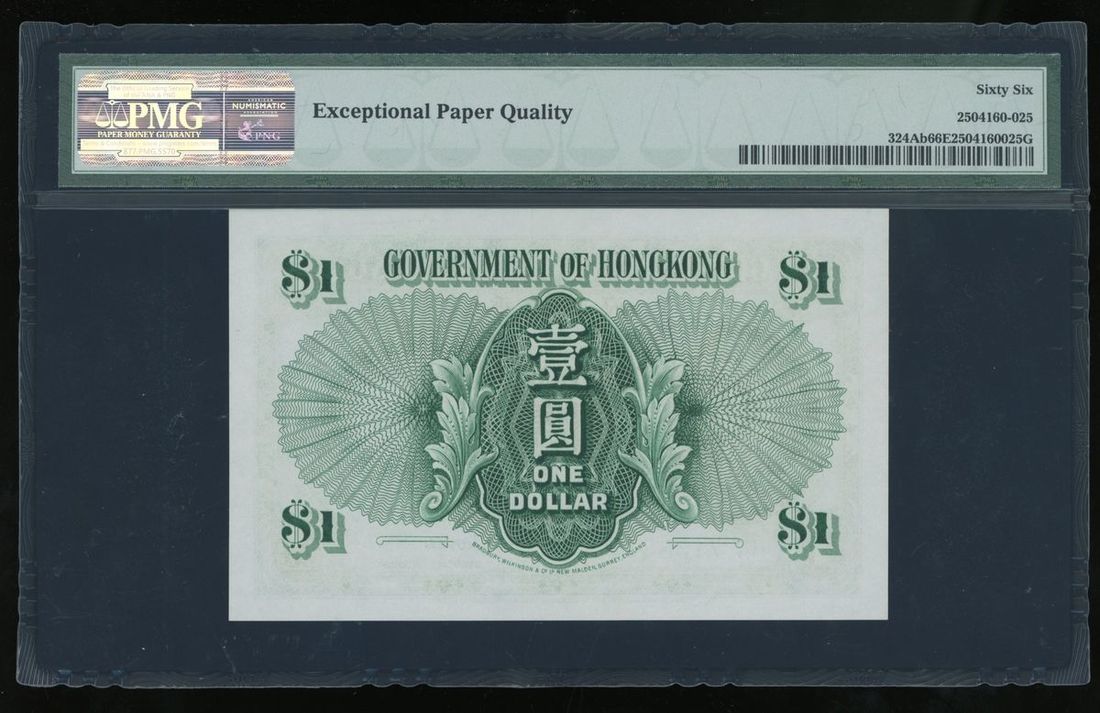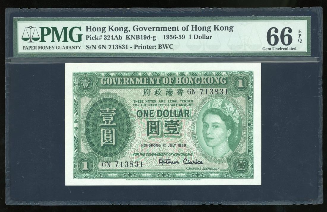 Government of HongKong, $1, 1.7.1959, serial number 6N 713931, (Pick 324Ab), PMG 66EPQ