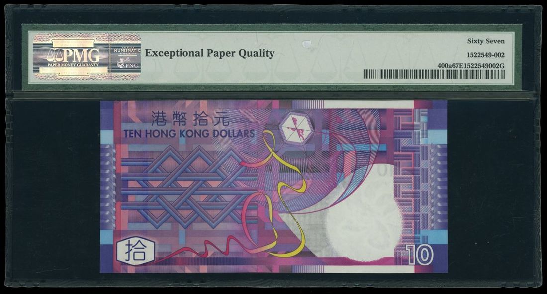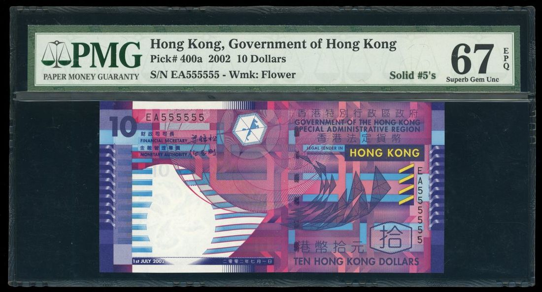 Government of HongKong, $10, 1.7.2002, solid serial number EA555555, (Pick 400a), PMG 67EPQ Superb Gem Uncirculated.