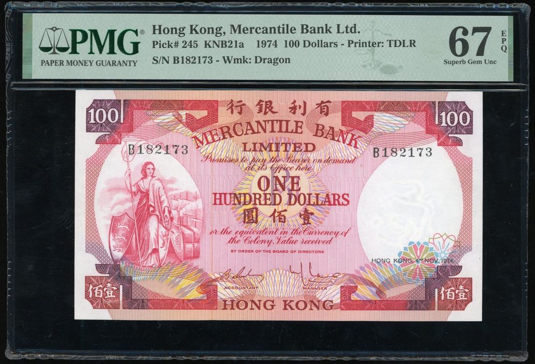 Mercantile Bank Limited, Hong Kong, $100, 1974, serial number B182173, red and multicolour underprint, Britannia at left,