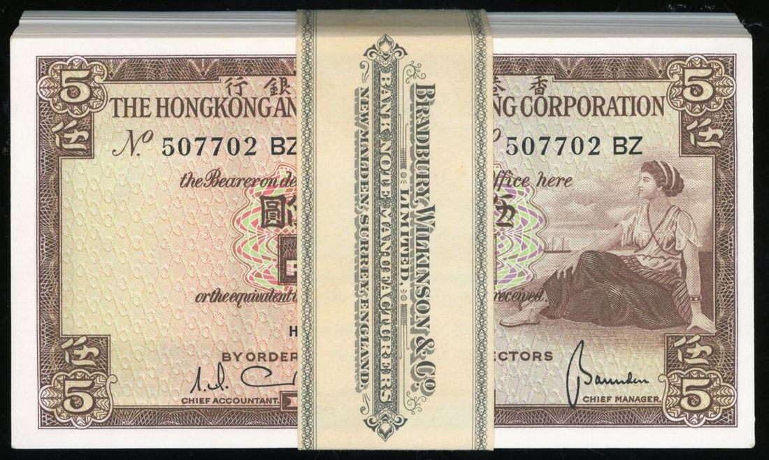 1967年香港匯豐銀行伍圓一組99枚,連號507702-507800 BZ,邊緣帶有些微折軟,UNC品相,原裝印鈔商封條