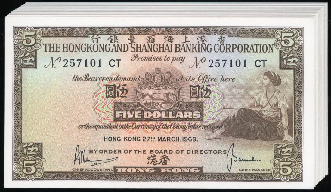 HongKong and Shanghai Banking Corporation, consecutive $5 (50), 27.3.1969, serial number 257101-150 CT, (Pick 181c), first note with some discolouration, otherwise all uncirculated (50