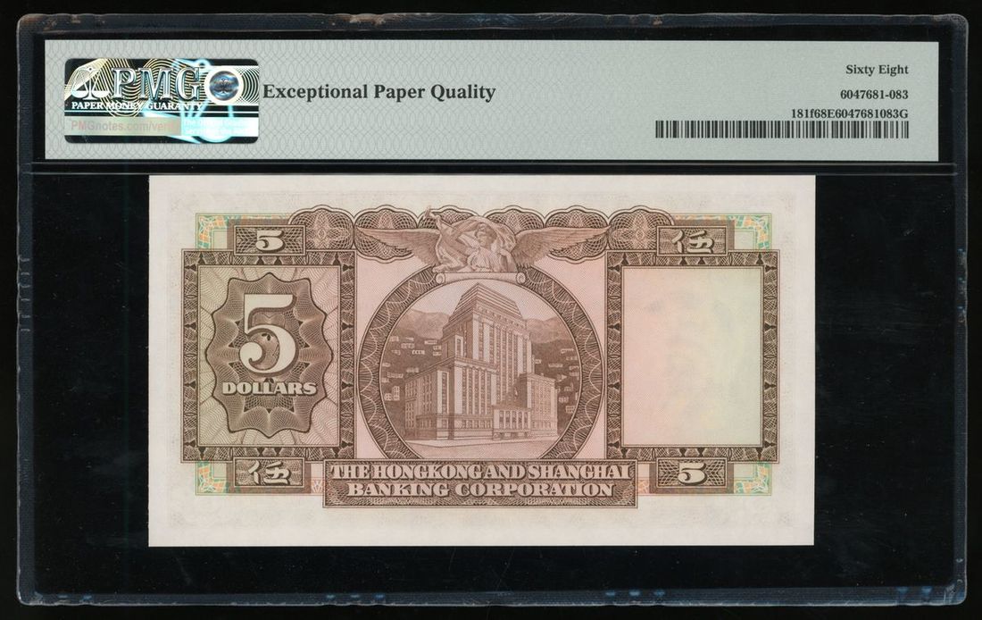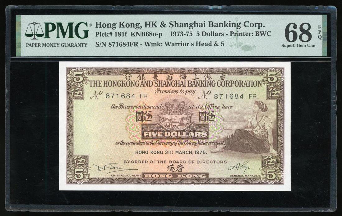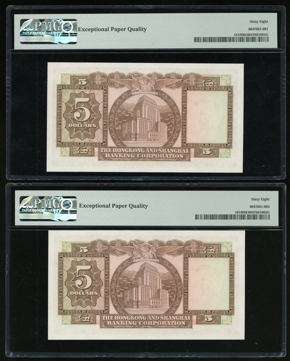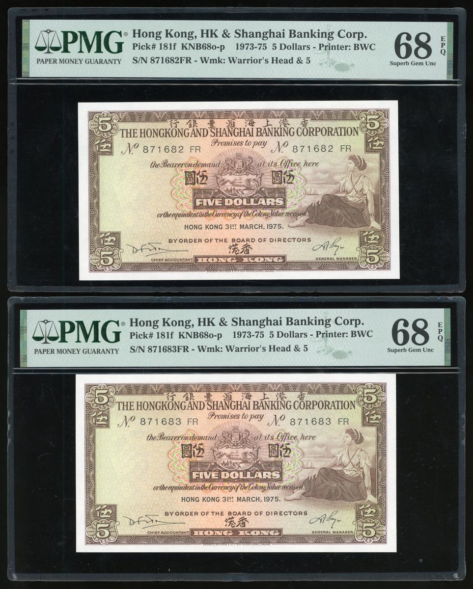 1975年香港匯豐銀行伍圓一組3枚,連號871682/3/4FR,PMG均評68EPQ
