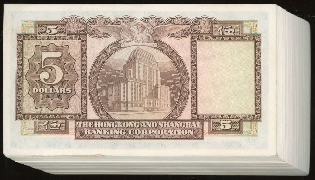 HongKong and Shanghai Banking Corporation, consecutive bundle of $5 (100), 31.3.1975, serial numbers 210001-210100 FQ, include radar serial number 210012,