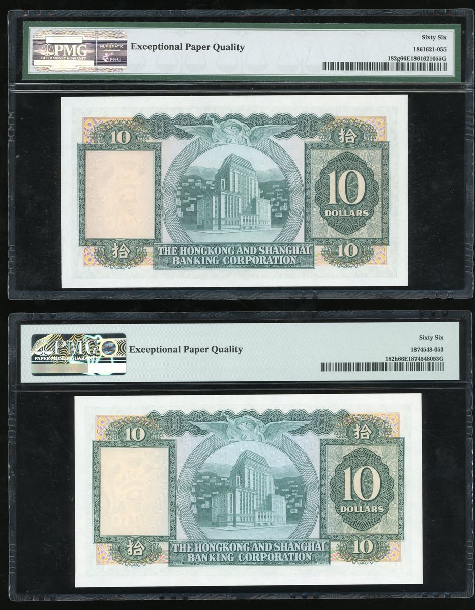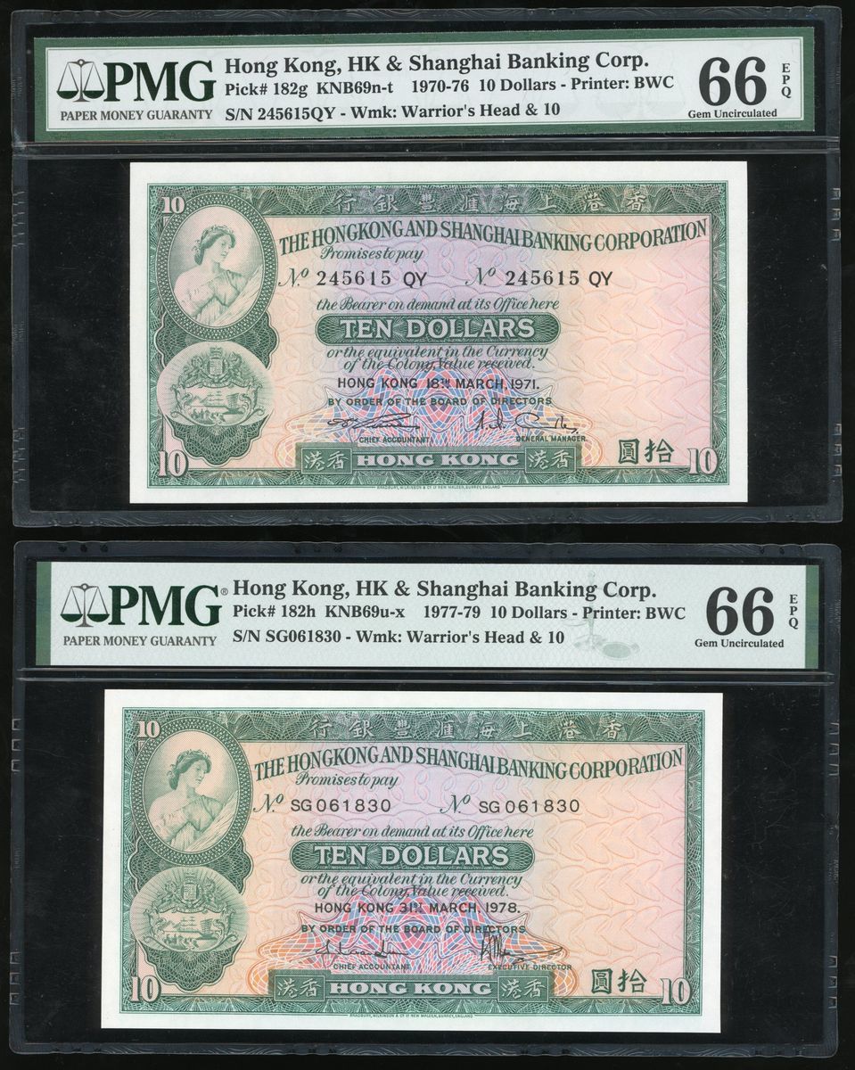 (x) HongKong and Shanghai Banking Corporation, $10 (2), 1971, 1978, serial numbers 245615QY, SG061830, (Pick 182g, h), both PMG 66EPQ (2)