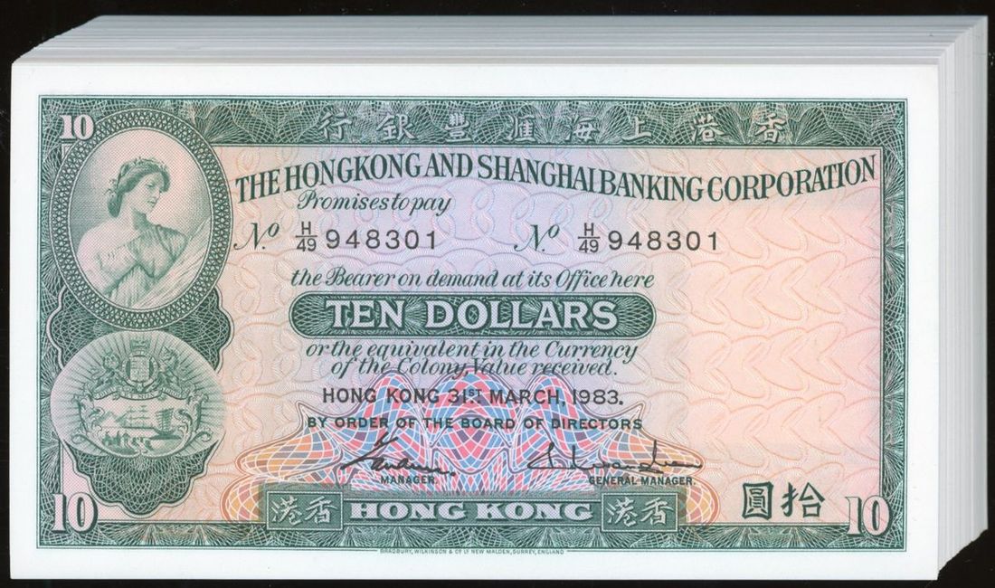 HongKong and Shanghai Banking Corporation, consecutive bundle of $10 (100), 31.3.1983, serial numbers H/49 948301-400, (Pick 182j), problem free, completely original as issued (100)