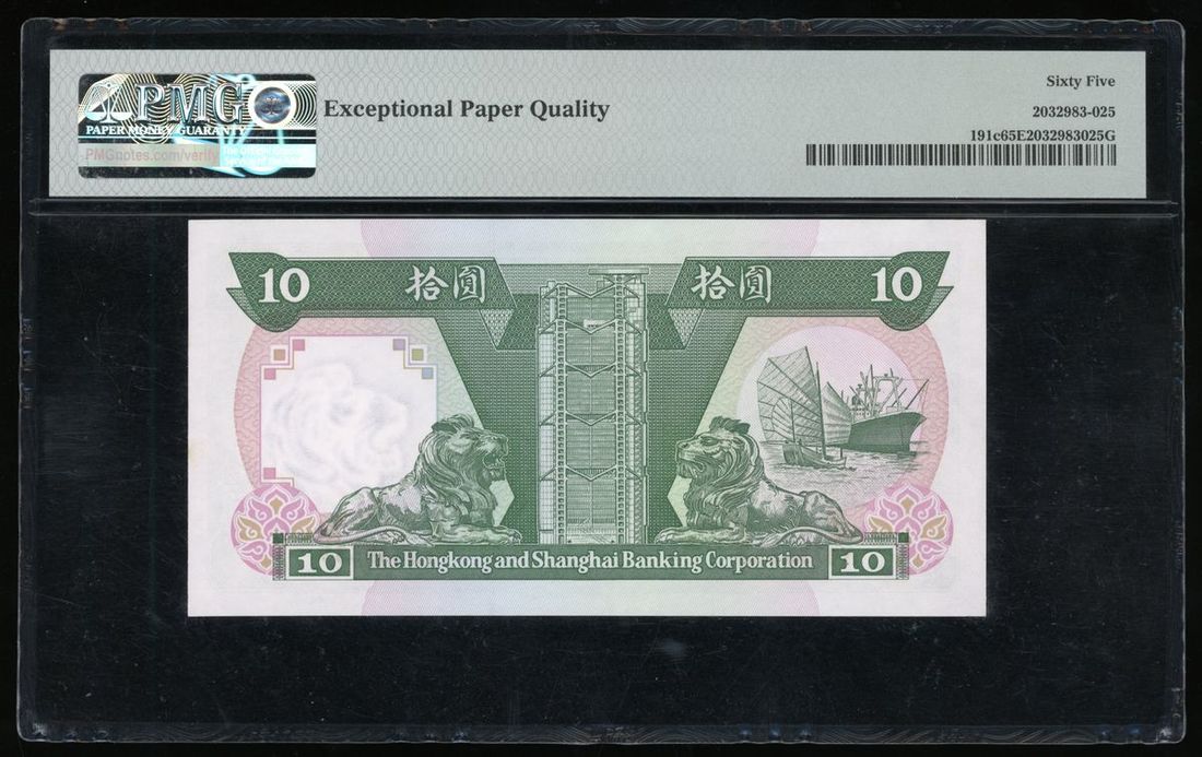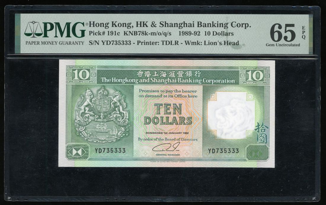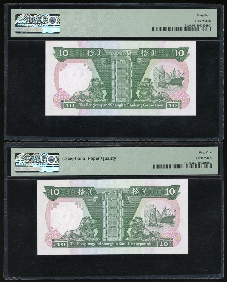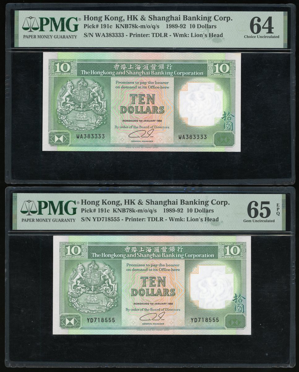 Hongkong and Shanghai Banking Corporation, A group of 3x including $10 (3), 1.1.1982, serial number WA383333, YD718555, YD736333, (Pick 191c), PMG 64 Choice Uncirculated, 65EPQ Gem Uncirculated (2)