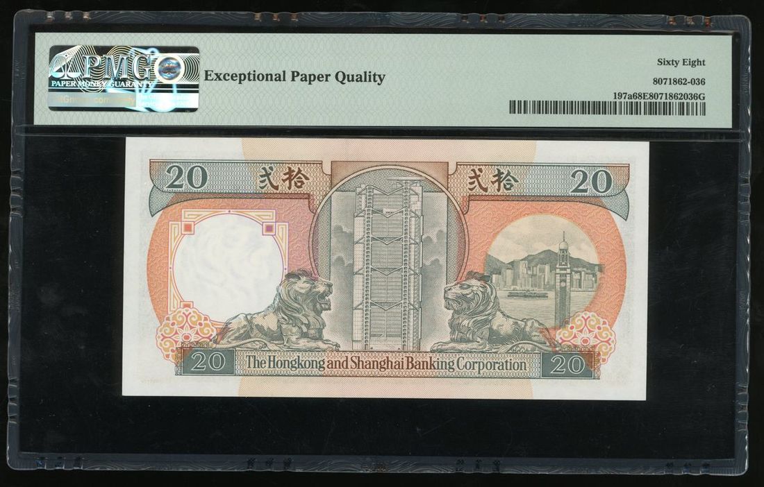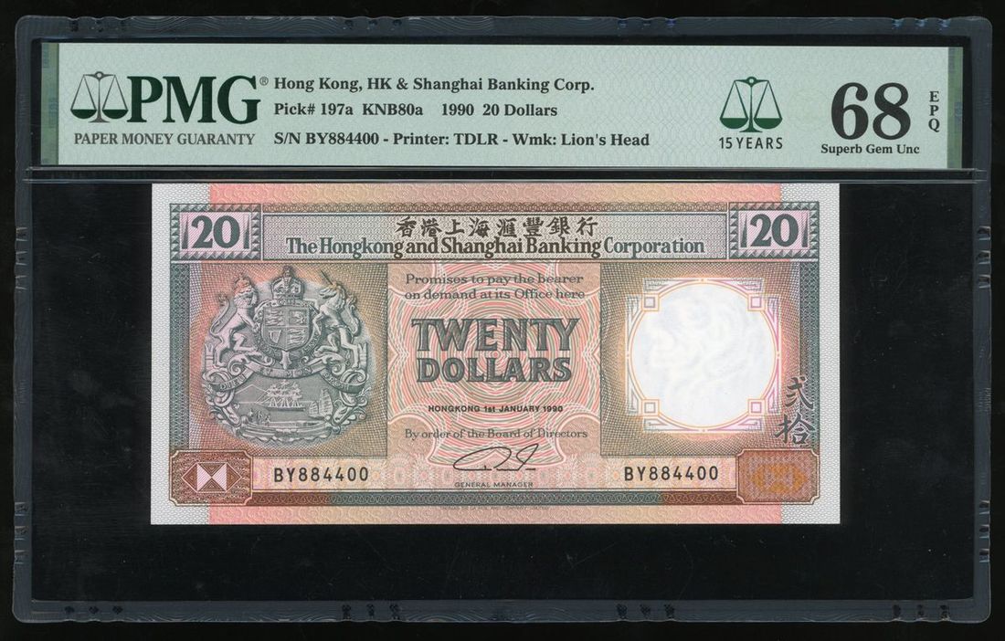 Hongkong and Shanghai Banking Corporation, $20, 1.1.1990, semi fancy serial number BY884400, (Pick 197a), PMG 68EPQ Superb Gem Uncirculated.