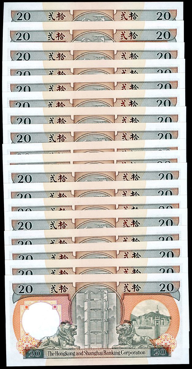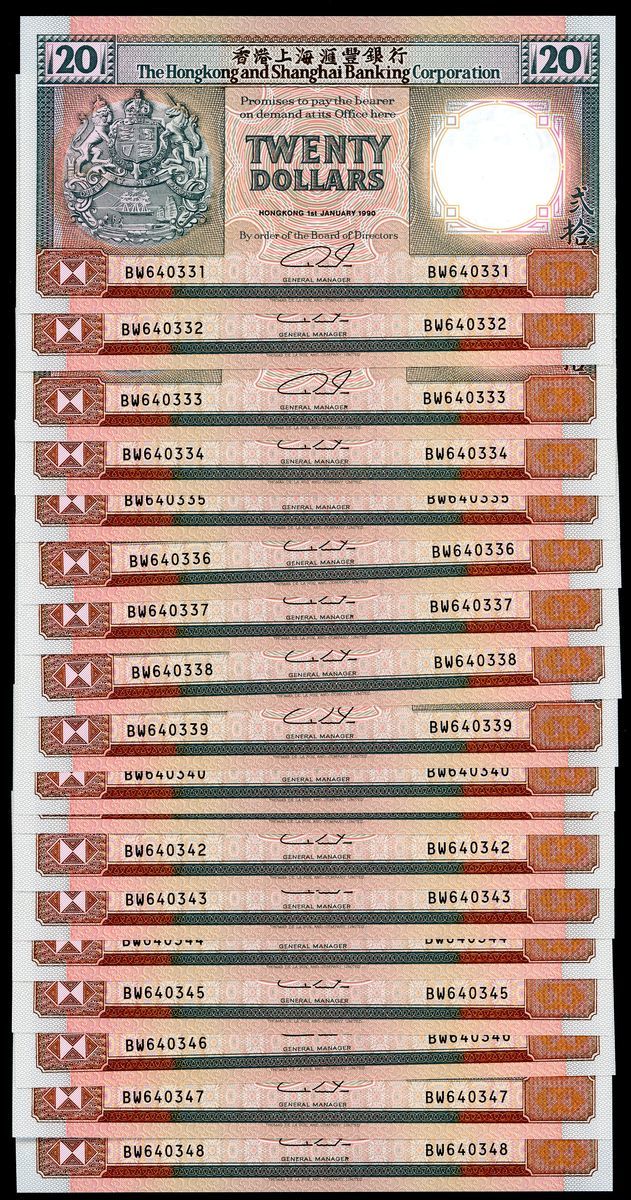 HongKong and Shanghai Banking Corporation, consecutive $20 (18), 1.1.1990, serial numbers BW640331-640348, (Pick 197a), crisp uncirculated (18)