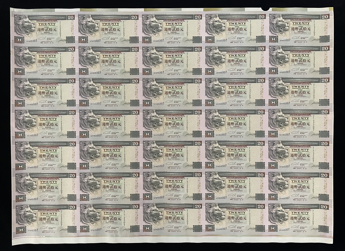 Hongkong and Shanghai Banking Corporation, an uncut sheet of 35x $20, 1.1.1995, the last three digits ending in '307', (Pick 201b), mostly Uncirculated