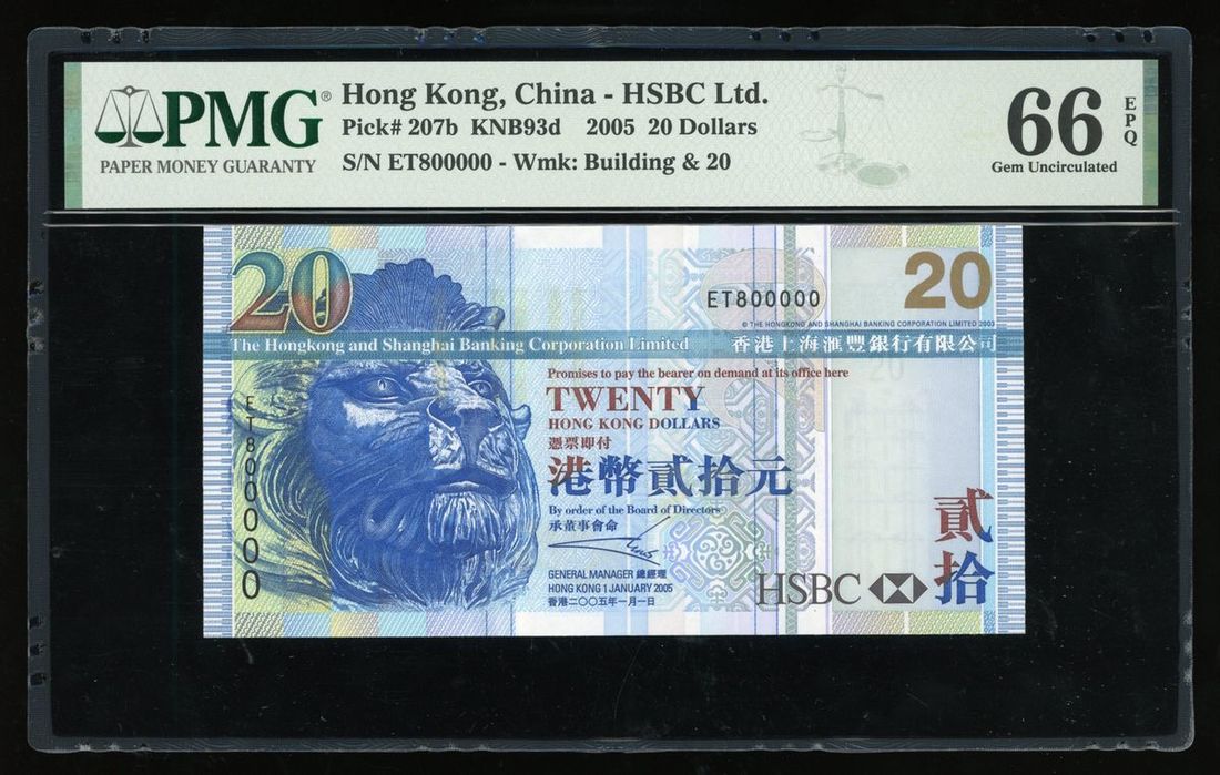 The Hongkong and Shanghai Banking Corporation, $20, 1.1.2005, serial number ET 800000, (Pick 207b), PMG 66EPQ Gem Uncirculated