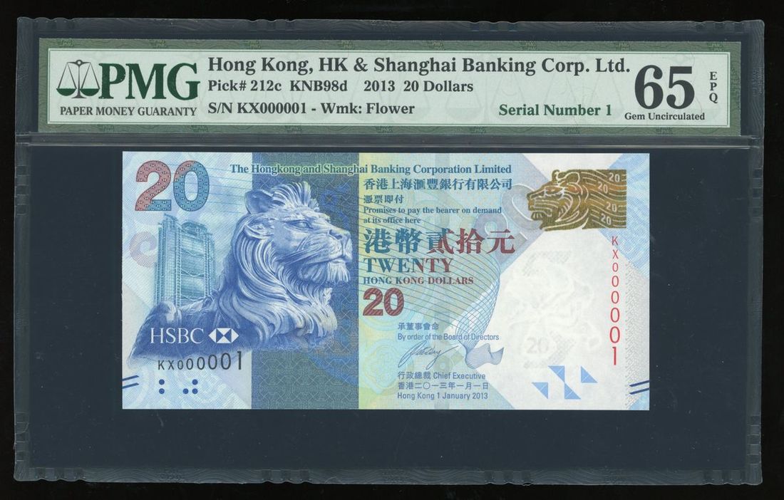 2013年香港匯豐銀行貳拾元,細編號KX 000001,PMG 65EPQ