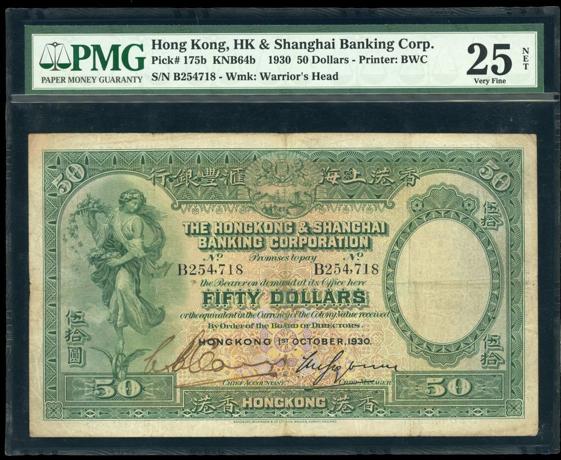 HongKong & Shanghai Banking Corporation, $50, 1.1.1930, serial number B254718, one handsigned signature,