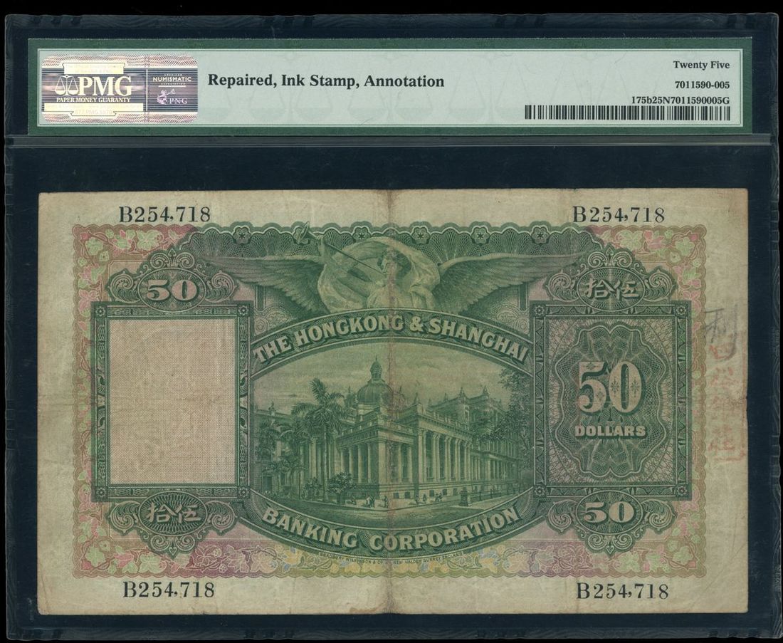 1930年香港匯豐銀行伍拾圓,左下手簽,編號B 254718,PMG 25NET,有修補、墨印及筆註