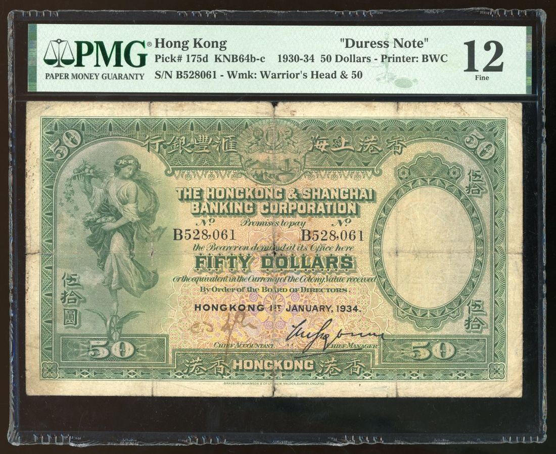 HongKong & Shanghai Banking Corporation, DURESS $50, 1.1.1934, serial number B528061, one handsigned signature,
