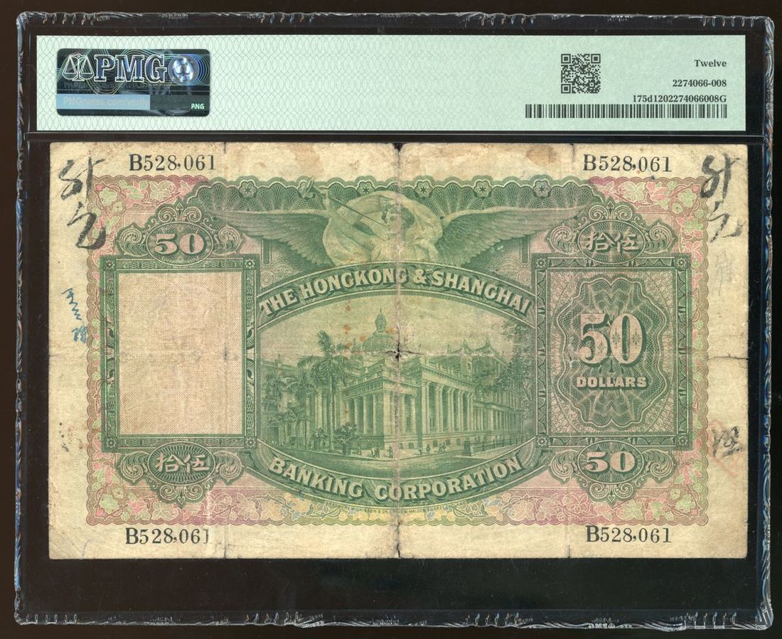 1934年香港匯豐銀行伍拾圓迫簽票,左下手簽,編號B 528061,PMG 12