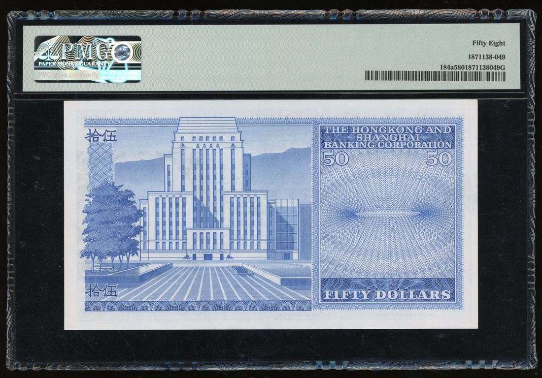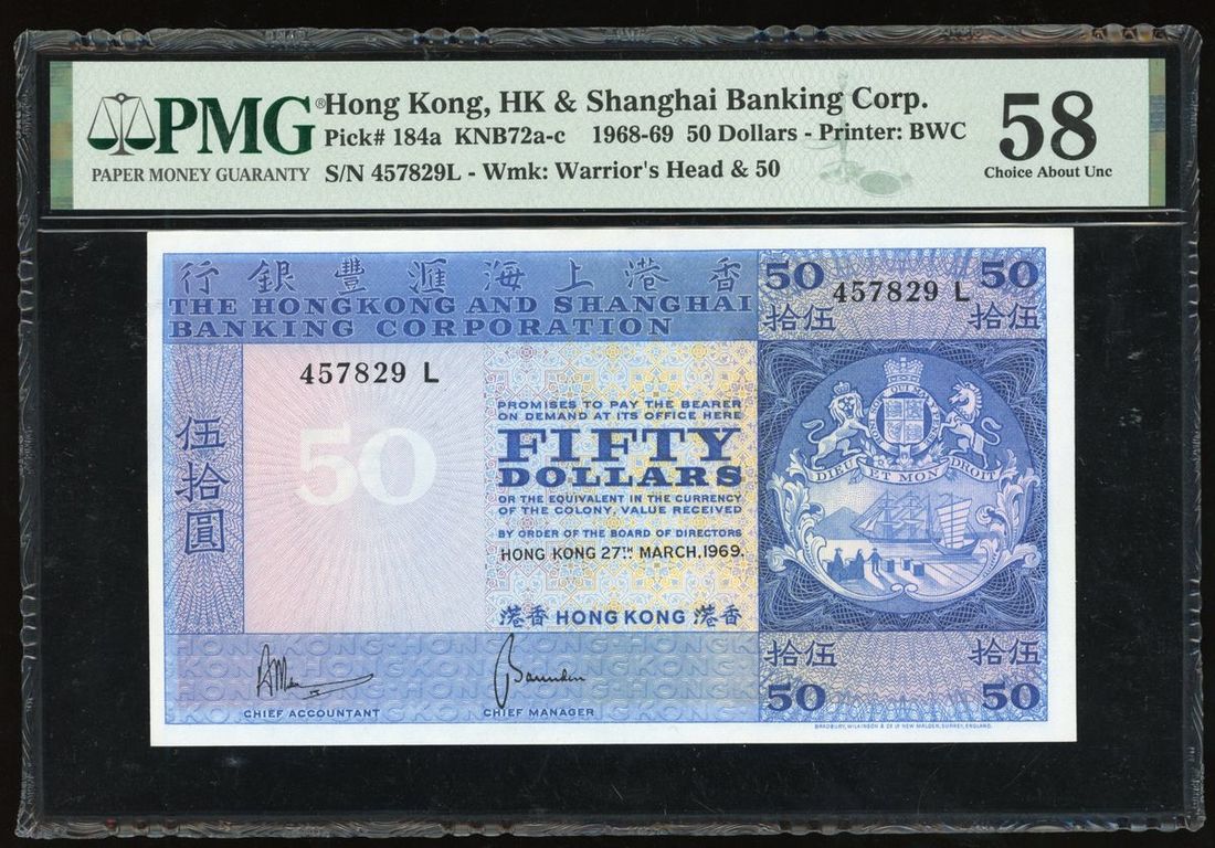 Hong Kong and Shanghai Banking Corporation, $50, 27.3.1969, serial number 457829L, (Pick 184a), PMG 58