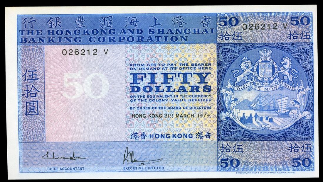 HongKong and Shanghai Banking Corporation, $50, 31.3.1979, serial number 026212V, 'key date', (Pick 184e), uncirculated