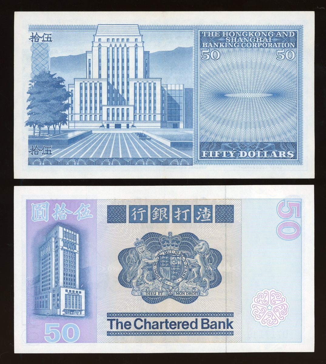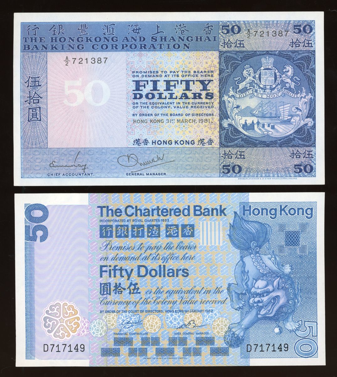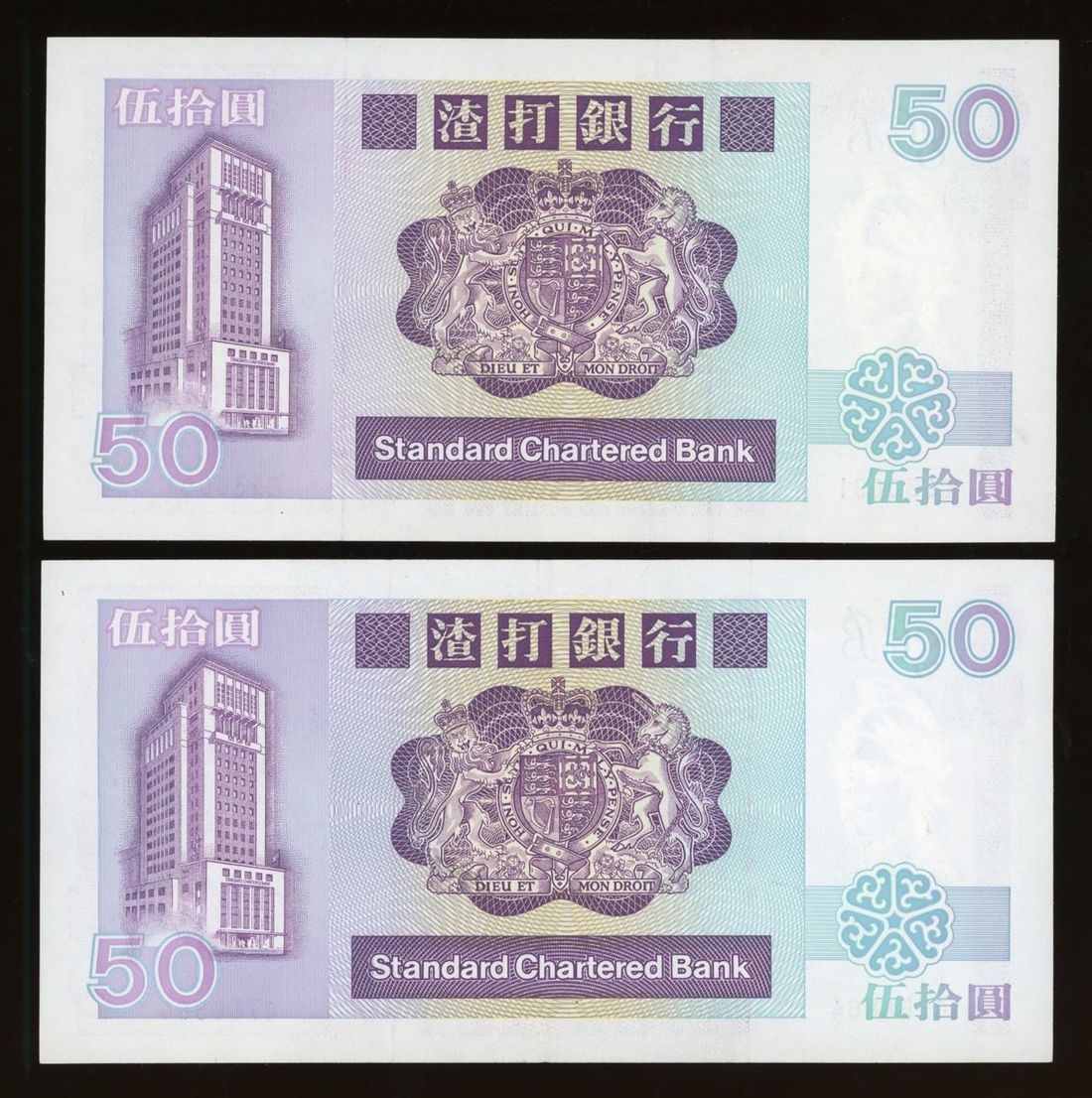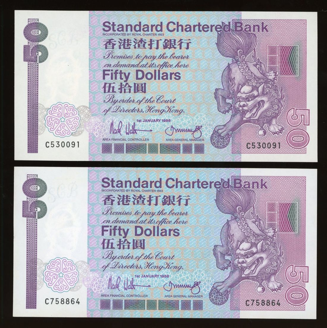 1981-1988年香港匯豐銀行及渣打銀行伍拾圓一組4枚,編號A2 721387、D717149、C530091及C758864,EF至UNC品相,有些微發黃
