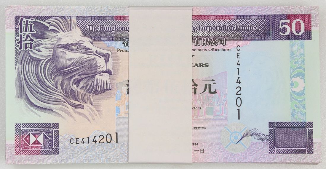 1994年香港匯豐銀行伍拾元一組100枚,連號CE414201-414300,若干有折軟,最後一枚角落有折痕,其他原裝UNC品相