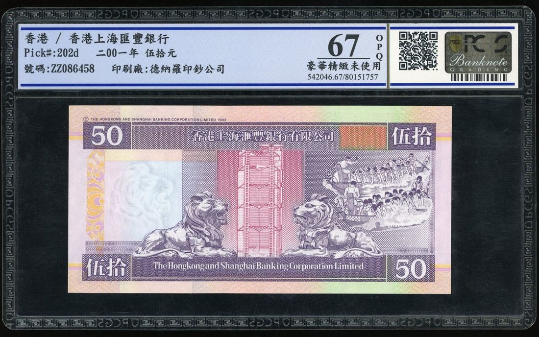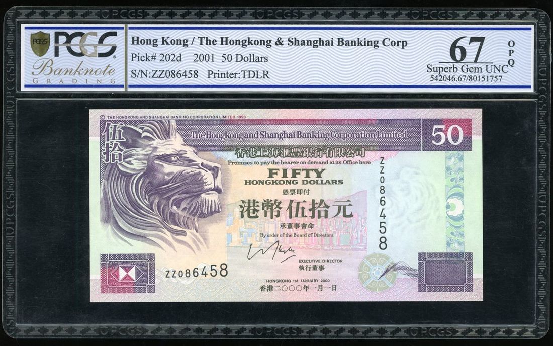Hongkong and Shanghai Banking Corporation, Replacement $50, 1.1.2000, serial number ZZ086458, (Pick 202d), PMG 67 Superb Gem Uncirculated