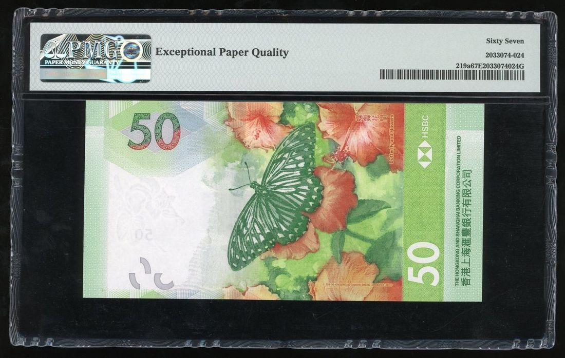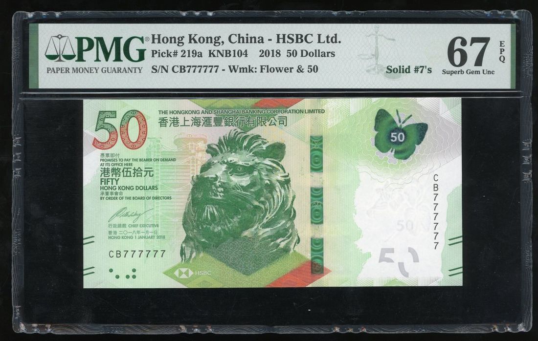 Hongkong and Shanghai Banking Corporation, $50, 1.1.2018, solid serial number CB777777, (Pick 219a), PMG 67EPQ Gem Uncirculated.
