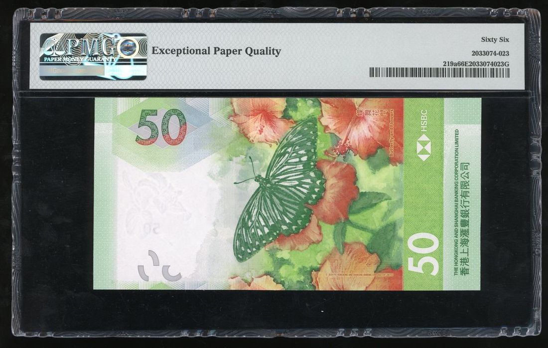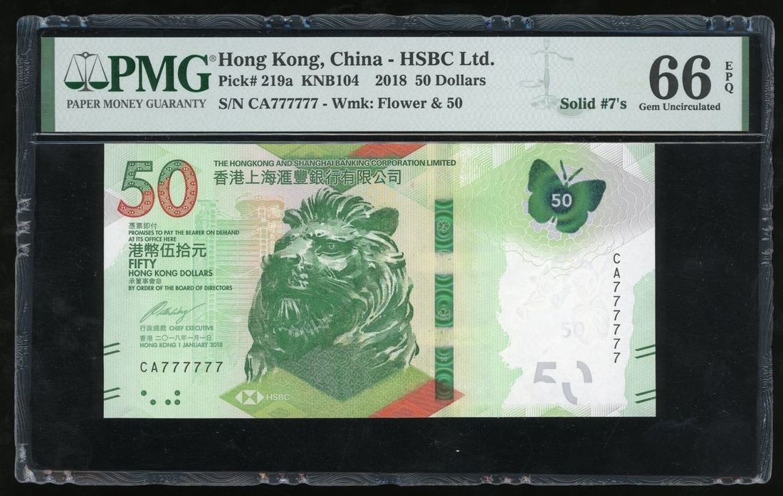 Hongkong and Shanghai Banking Corporation, $50, 1.1.2018, solid serial number CA777777, (Pick 219a), PMG 66EPQ Gem Uncirculated.